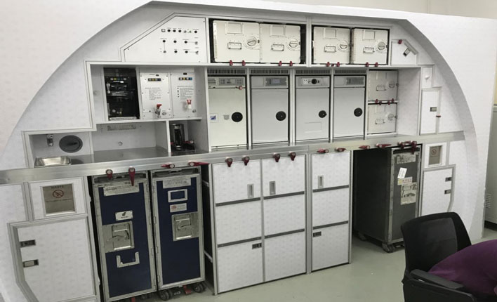 訓(xùn)練艙模擬飛機(jī)的真實(shí)環(huán)境。它能滿足航空客艙乘務(wù)員訓(xùn)練的各種要求,訓(xùn)練艙包括有 B737-800飛機(jī)頭等艙和經(jīng)濟(jì)艙各一段、B737-800前門區(qū)、廚房、盥洗室和A320后門區(qū)等。