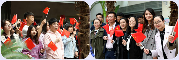 快閃活動持續(xù)推向高潮,更多的同學(xué)被吸引進(jìn)來,舞蹈與唱歌的同學(xué)不時變換位置,形成新的隊(duì)形,擺出新的姿勢,整個活動愈發(fā)精彩。在一旁圍觀的同學(xué)們也揚(yáng)起了小紅旗,隨著歌聲與舞姿一起揮動。