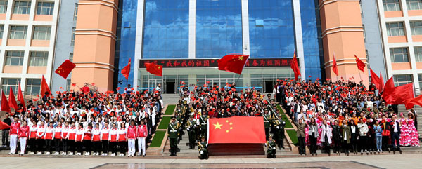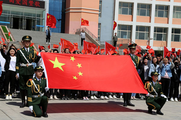 最后,在快閃演出的最高潮,學(xué)校國旗班同學(xué)邁著穩(wěn)重有力的步伐護(hù)旗走出,展開一面五星紅旗,全體演員紛紛肅立,向國旗行注目禮??扉W活動在重新響起的悠揚(yáng)弦樂聲中正式結(jié)束,現(xiàn)場響起了經(jīng)久不息的掌聲和歡呼聲。