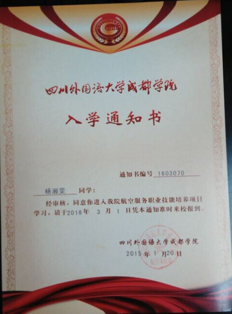 恭喜楊湘雯同學被我校錄取【川外成都航空】