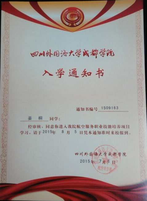 恭喜姜桐同學被我校錄取【川外成都航空】