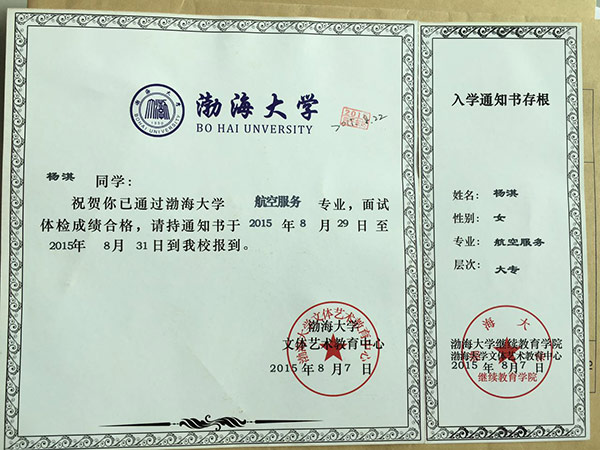 恭喜楊淇同學被我校錄取【渤海大學航空】