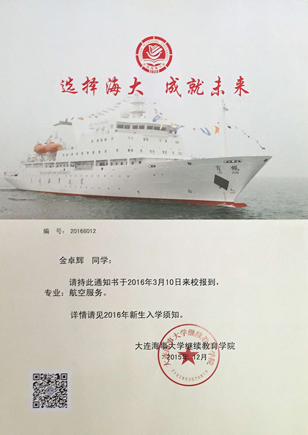 恭喜金卓輝同學(xué)被我校錄取【大連海事大學(xué)航空】